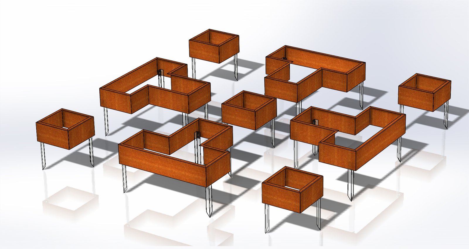 The composition consists of separate, fully welded elements that are placed on the ground and secured with metal stakes (the stakes are driven into the ground and fastened to the Corten elements with screws). All components of this composition feature folded edges, adding to the product’s aesthetic appeal.