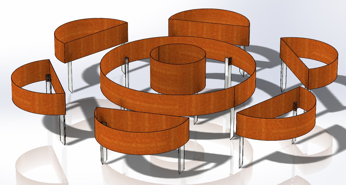 The edging height of the composition is 200 mm, while the central circular edging is 250 mm. Custom heights are also available upon request. When installing the composition in the desired location, the spacing between elements can be adjusted individually.