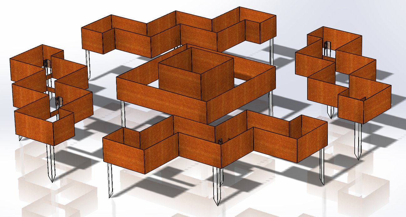 A uniquely beautiful composition consisting of separate, fully welded elements. All elements are placed on the ground and secured with metal stakes (the stakes are driven into the ground and fastened to the Corten elements with screws).