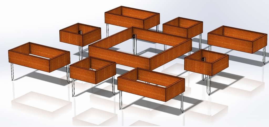 A uniquely beautiful composition consisting of separate, fully welded elements. All elements are placed on the ground and secured with metal stakes (the stakes are driven into the ground and fastened to the Corten elements with screws).