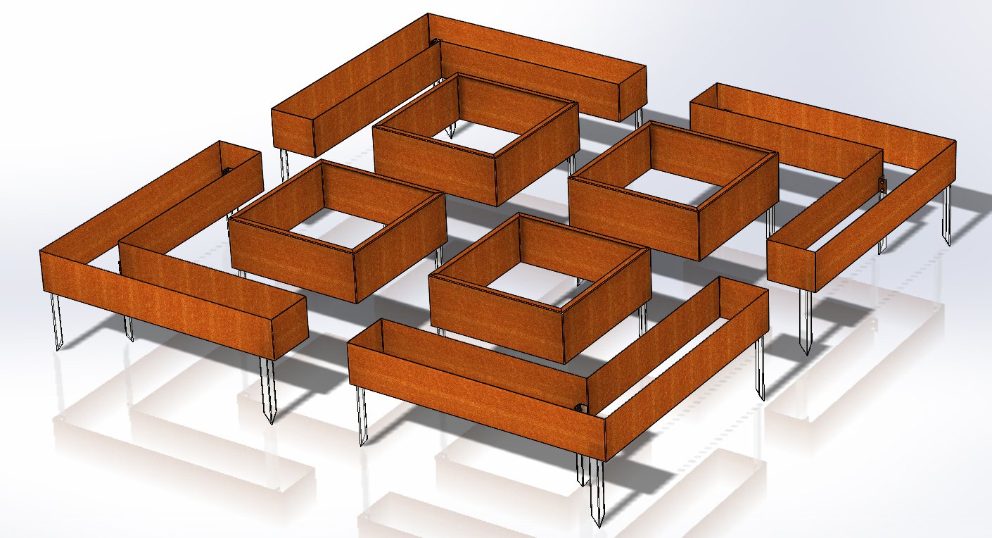 A uniquely beautiful composition consisting of separate, fully welded elements. All elements are placed on the ground and secured with metal stakes (the stakes are driven into the ground and fastened to the Corten elements with screws).