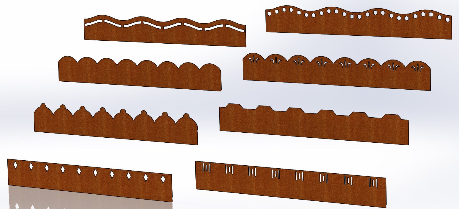 For those seeking an original, exclusive, and decorative landscape design, we offer Corten steel curbs with various ornamental designs on the top – the visible part of the curb. This stylish and playful choice is perfect for creating a unique landscape. The visualizations showcase eight types of curbs, easily adaptable to different architectural structures, design elements, and the prevailing style of your courtyard or garden spaces.