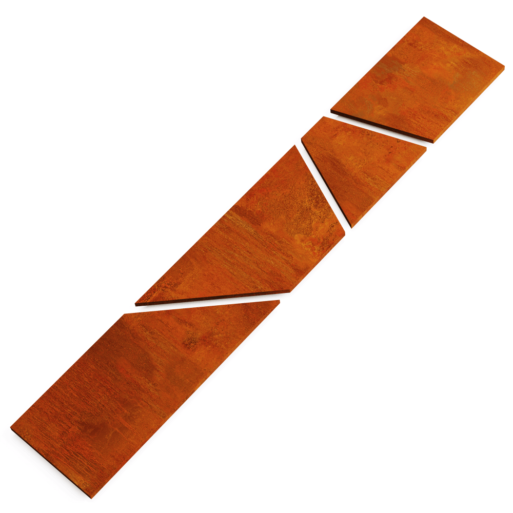 The tiles are made from 4 mm thick Corten steel and feature a 30 mm bent edge, adding volume and dimension. Reinforcement ribs on the inner side ensure a stable and durable structure, guaranteeing long-lasting performance. Thanks to the unique color and texture of Corten steel, these tiles maintain their aesthetic appeal even after many years.