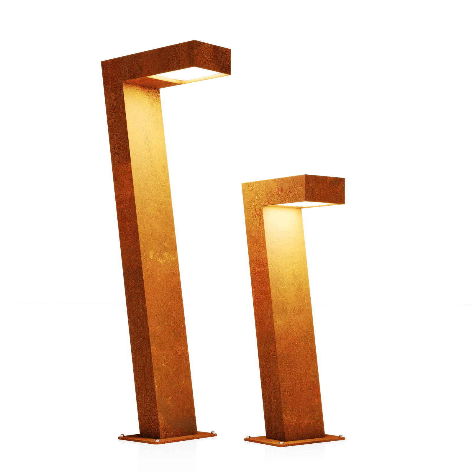 Visually robust, stylish Corten steel pathway light – TORK. Seeking to create aesthetic and cozy lighting. Well-planned lighting not only enhances safety but also beautifully illuminates pathways, gardens, parks, or terraces. The unique tilt angle of the fixture gives it an expressive and unconventional character, while its minimalist L-shaped design effortlessly adapts to any environment.