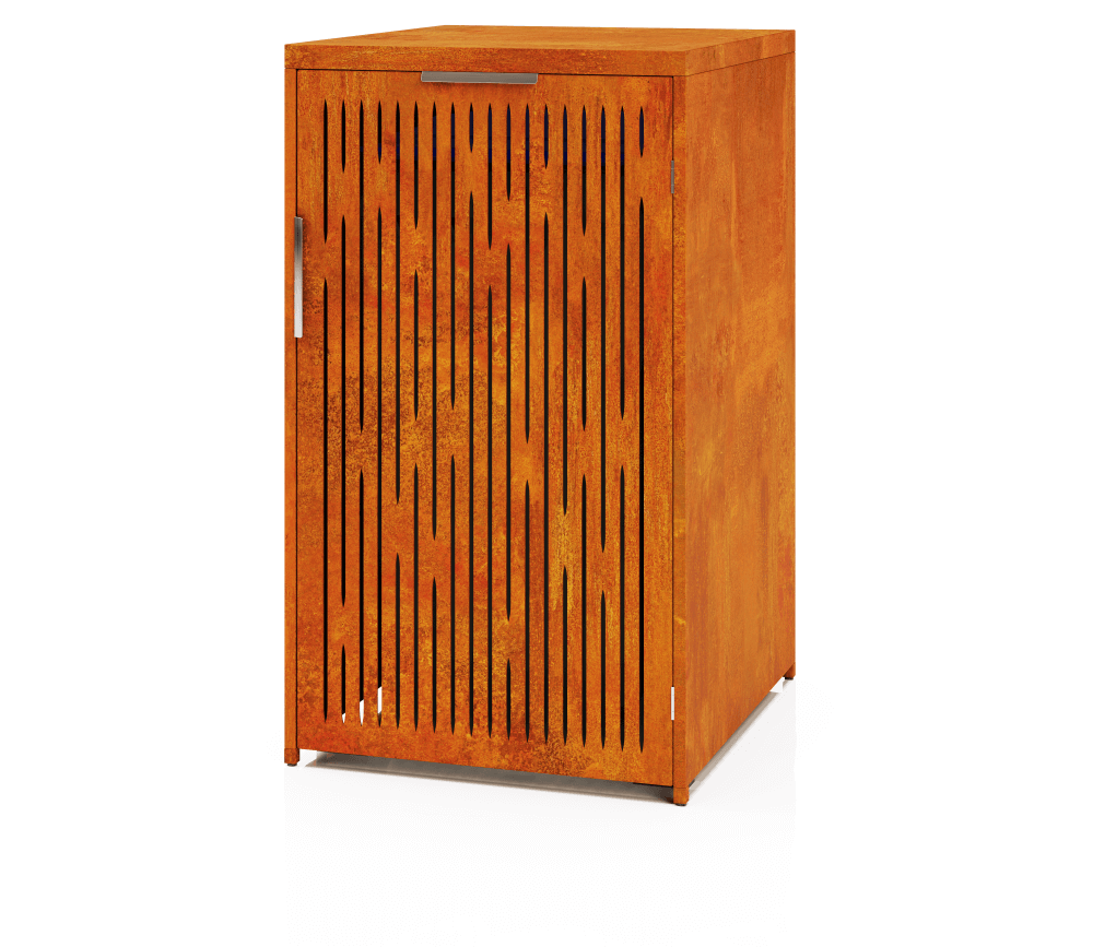 Modern and practical Corten steel waste container shelter – “Magnus”. The ideal solution for those who want to create a uniform and stylish waste sorting point while ensuring that outdoor spaces look neat and beautiful. The laser-cut selected pattern ensures air circulation and prevents the accumulation of bad odors.