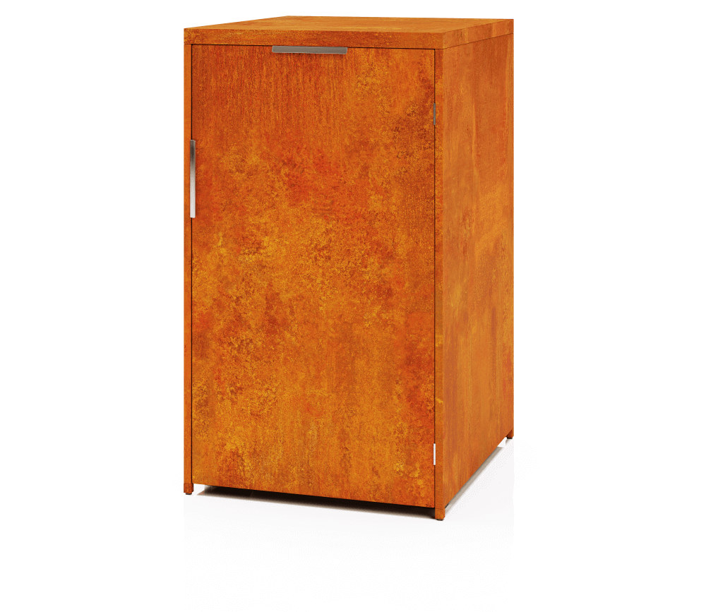 Modern and practical Corten steel waste container shelter – “Sofi”. The ideal solution for those who want to create a uniform and stylish waste sorting point, and ensure that outdoor spaces look neat and beautiful. The stylish and beautiful laser-cut pattern ensures air circulation and prevents the accumulation of bad odors.